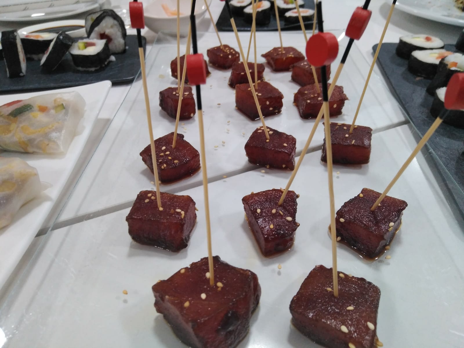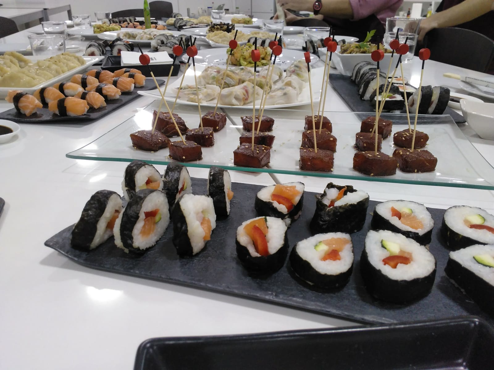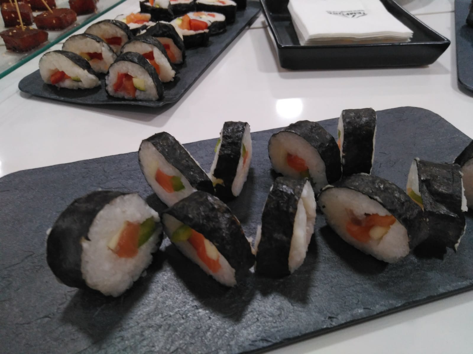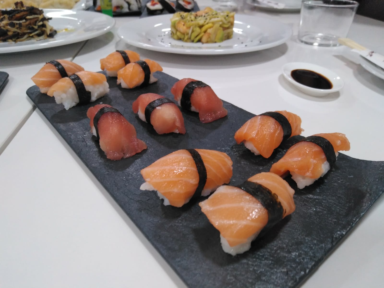 Hicimos makis, nigiris con salmón y atún, ensalada japonesa con