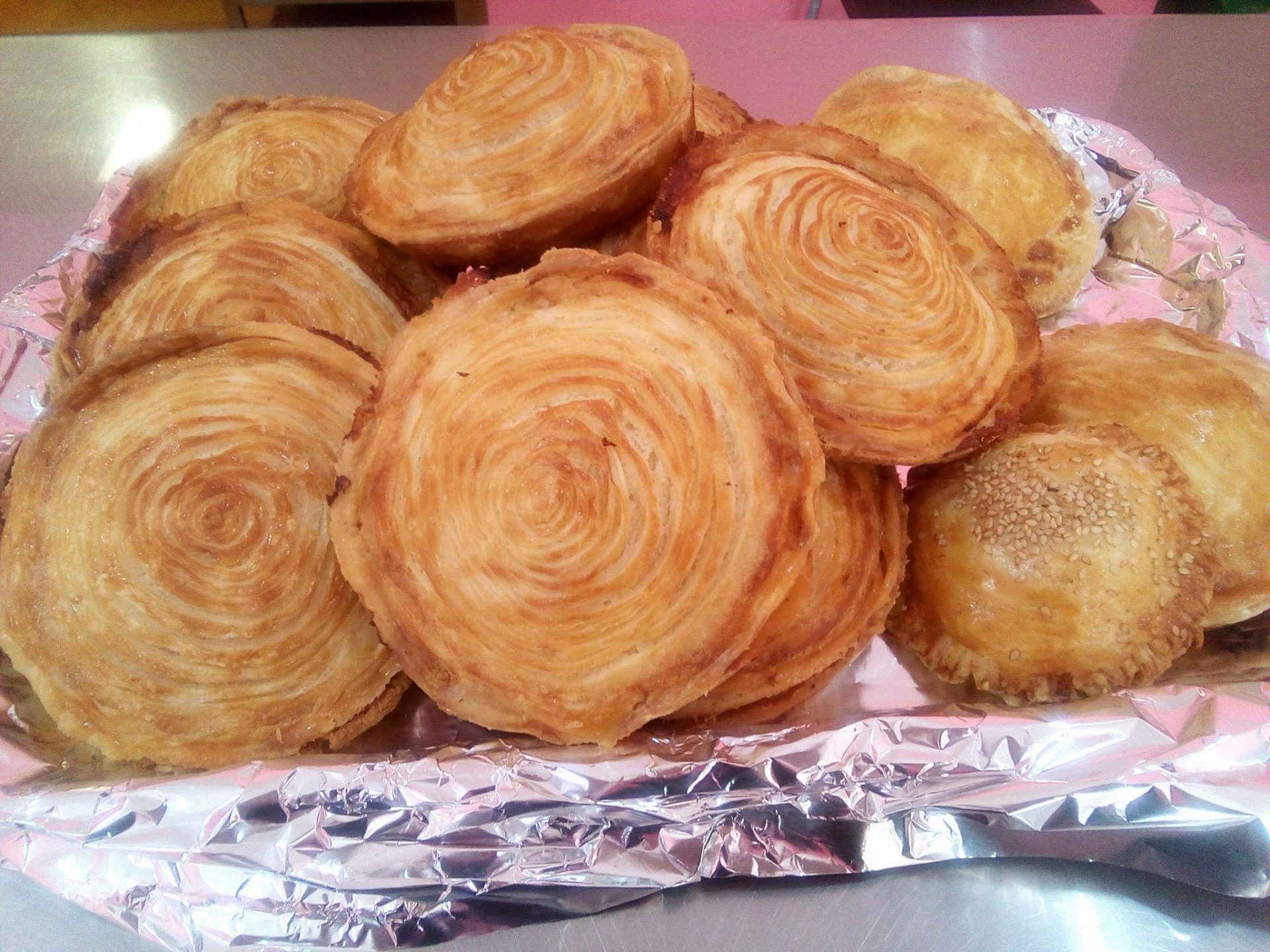 Empanadillas de hojaldre, rellenas de pisto con atún y huevo o de morcilla.